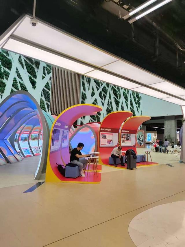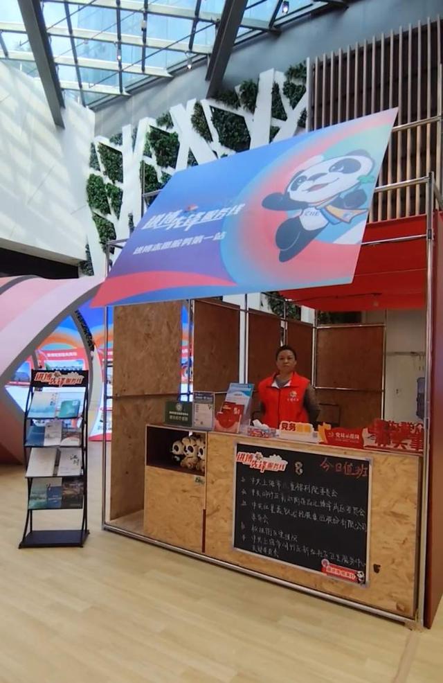 如果你只是想坐一会儿、休息一下,或者打开笔记本电脑“现场办公”,可以去配有了迷你沙发和桌椅的休息区。如果你有饮水需求,可以到志愿者服务岗亭找工作人员倒水。万一身体突发不适,你可以向岗亭值班的医疗志愿者求助。岗亭旁边的书报架上配有宣传资料,介绍“四叶草”周边的文旅商体展信息,供人取阅。总之,这里既是“一站式服务港湾”,也是你的“能量加油站”。