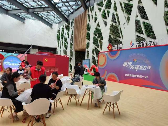 空间的名称叫进博七彩先锋党群服务站。最引人注目的花车区域,几辆花车一字排开,每辆花车都有不同的服务内容。记者采访当日,有的花车正在进行非遗特色展示,有的花车带来了企业特色商品,还有的花车推出咖啡DIY活动,吸引了不少人参与。