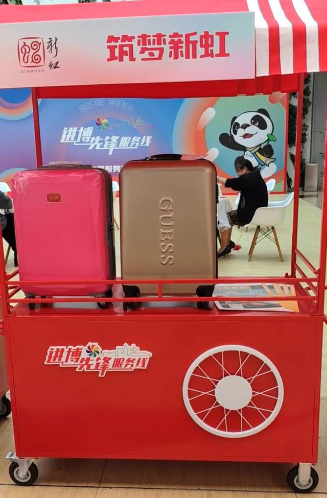其中一辆花车上,几个行李箱吸引了路人好奇的目光。工作人员告诉记者,如果旅客在虹桥枢纽突遇拉杆箱损坏,可以将损坏的箱子交给绿行循环商店,更换一只拉杆箱。这是进博期间举办的爱心箱循环公益活动,更换时需要支付50元押金。