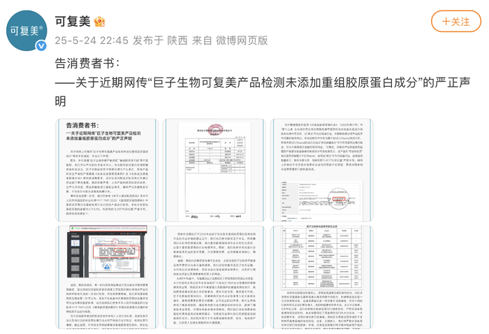 5月24日,@可复美发布关于近期网传“巨子生物可复美产品检测未添加重组胶原蛋白成分”的严正声明。